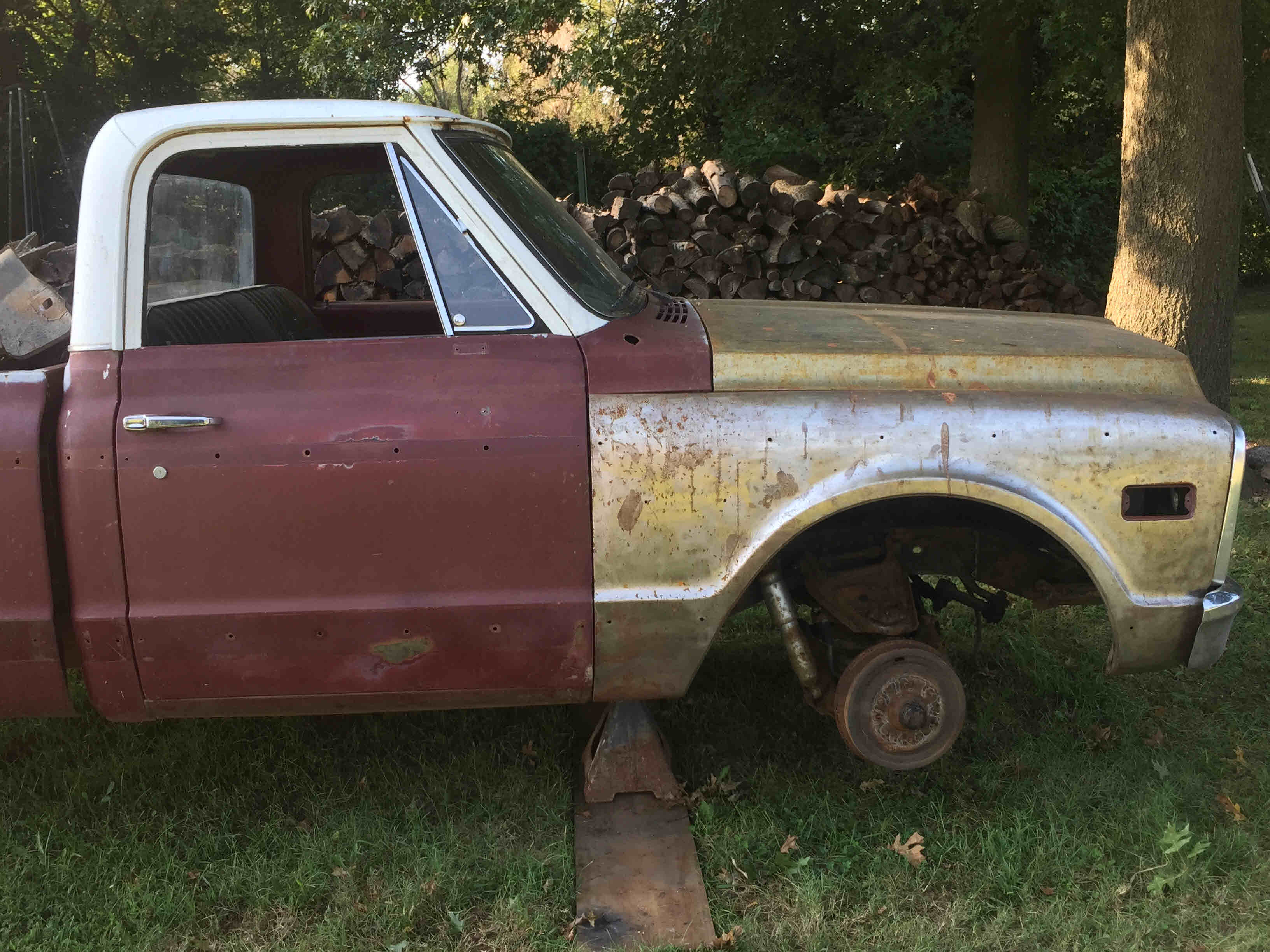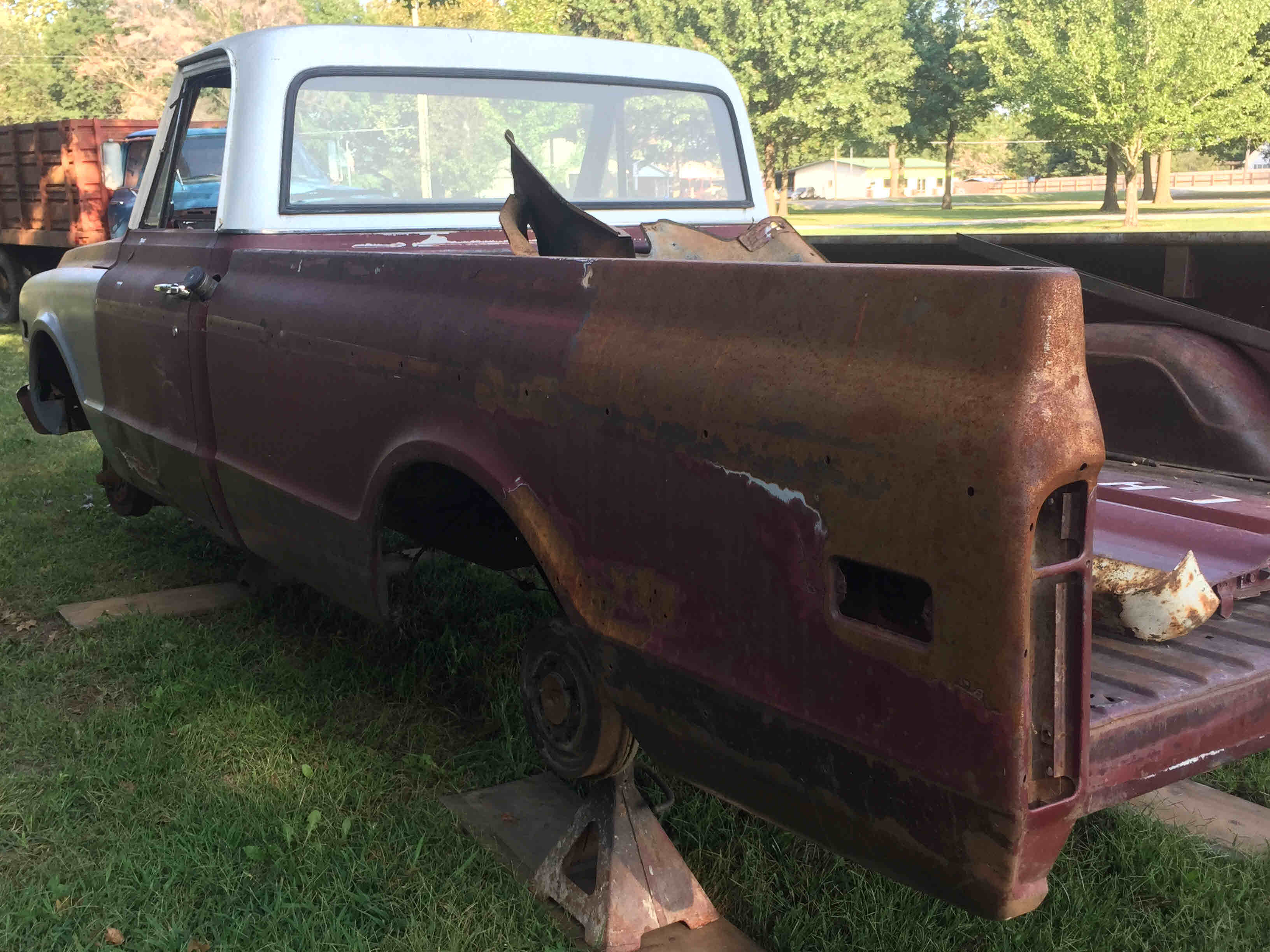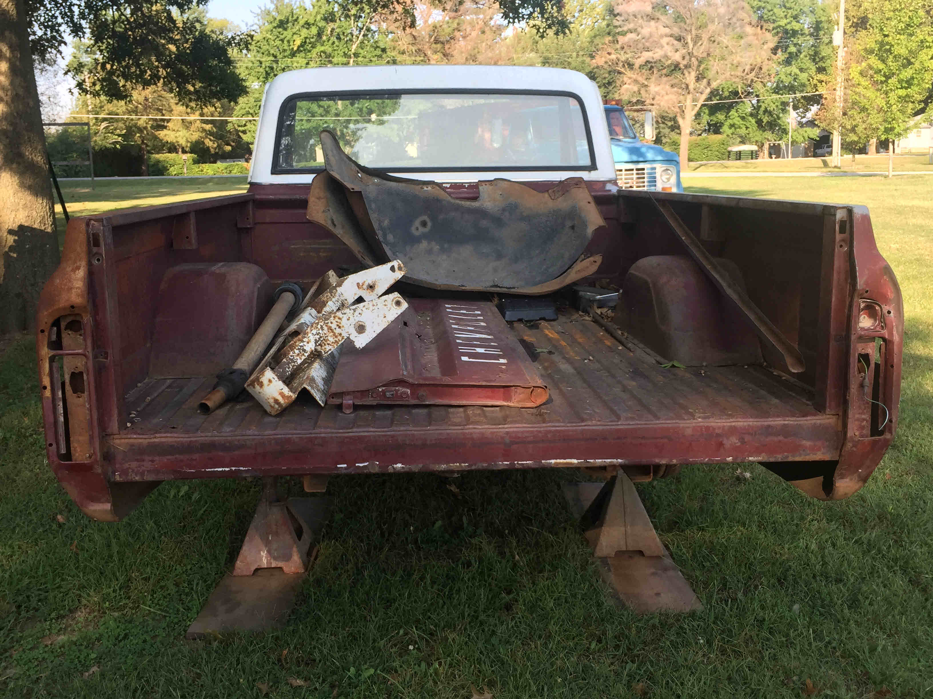 No motor or transmission. Just frame, cab, bed, front fenders, hood, doors. Needs 6 lug tires & rims.
