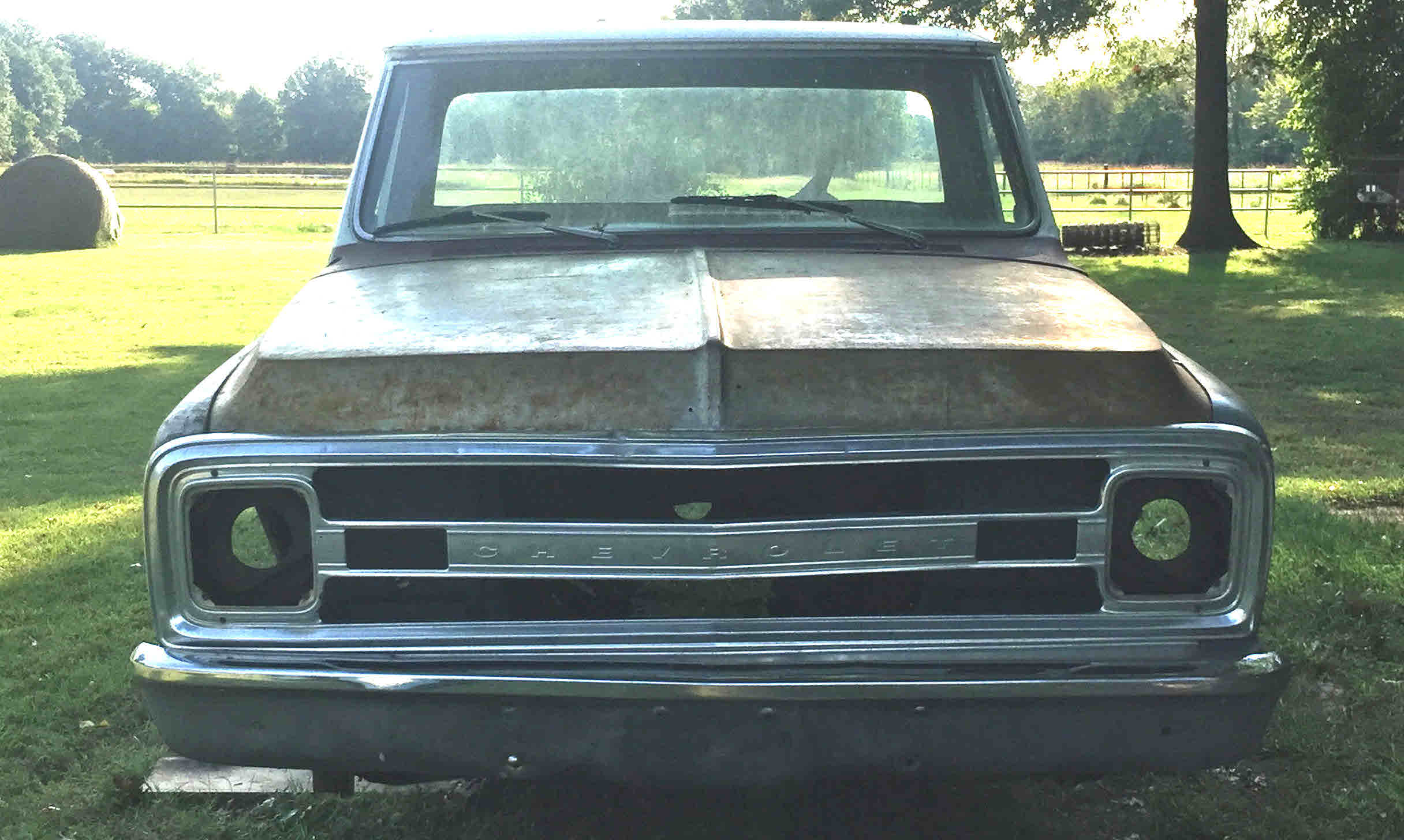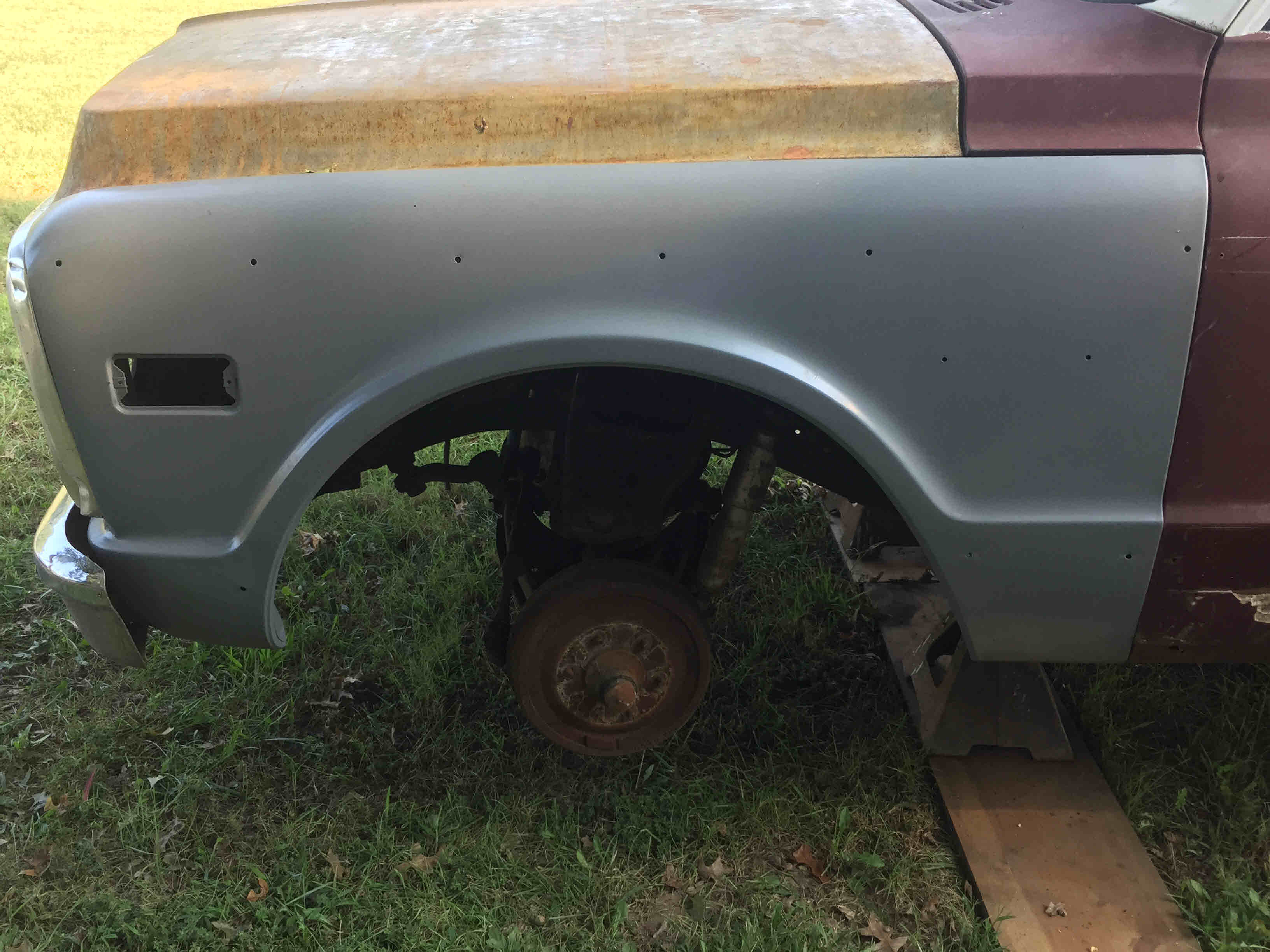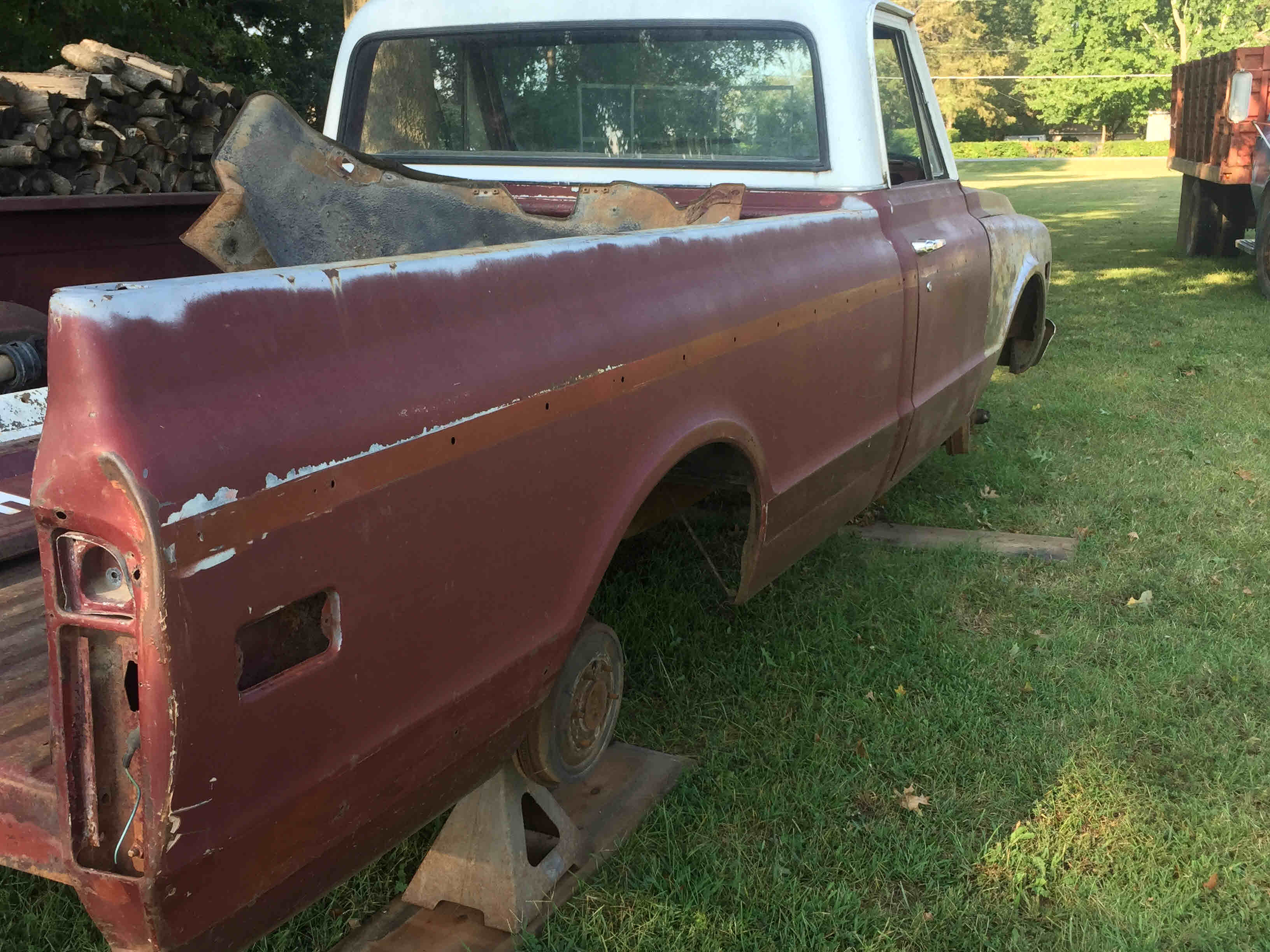 No motor or transmission. Just frame, cab, bed, front fenders, hood, doors. Needs 6 lug tires & rims.