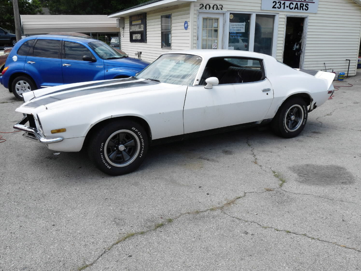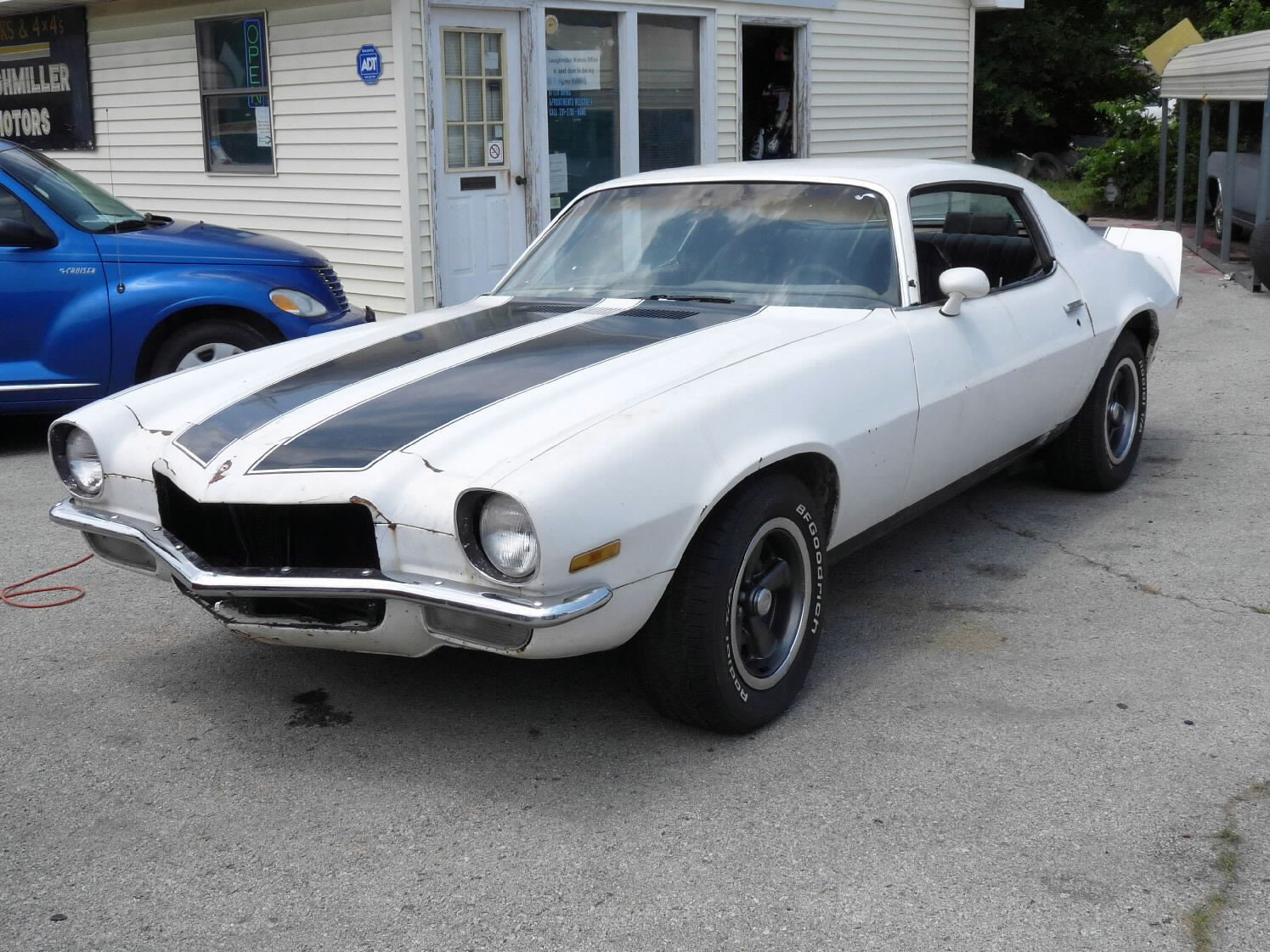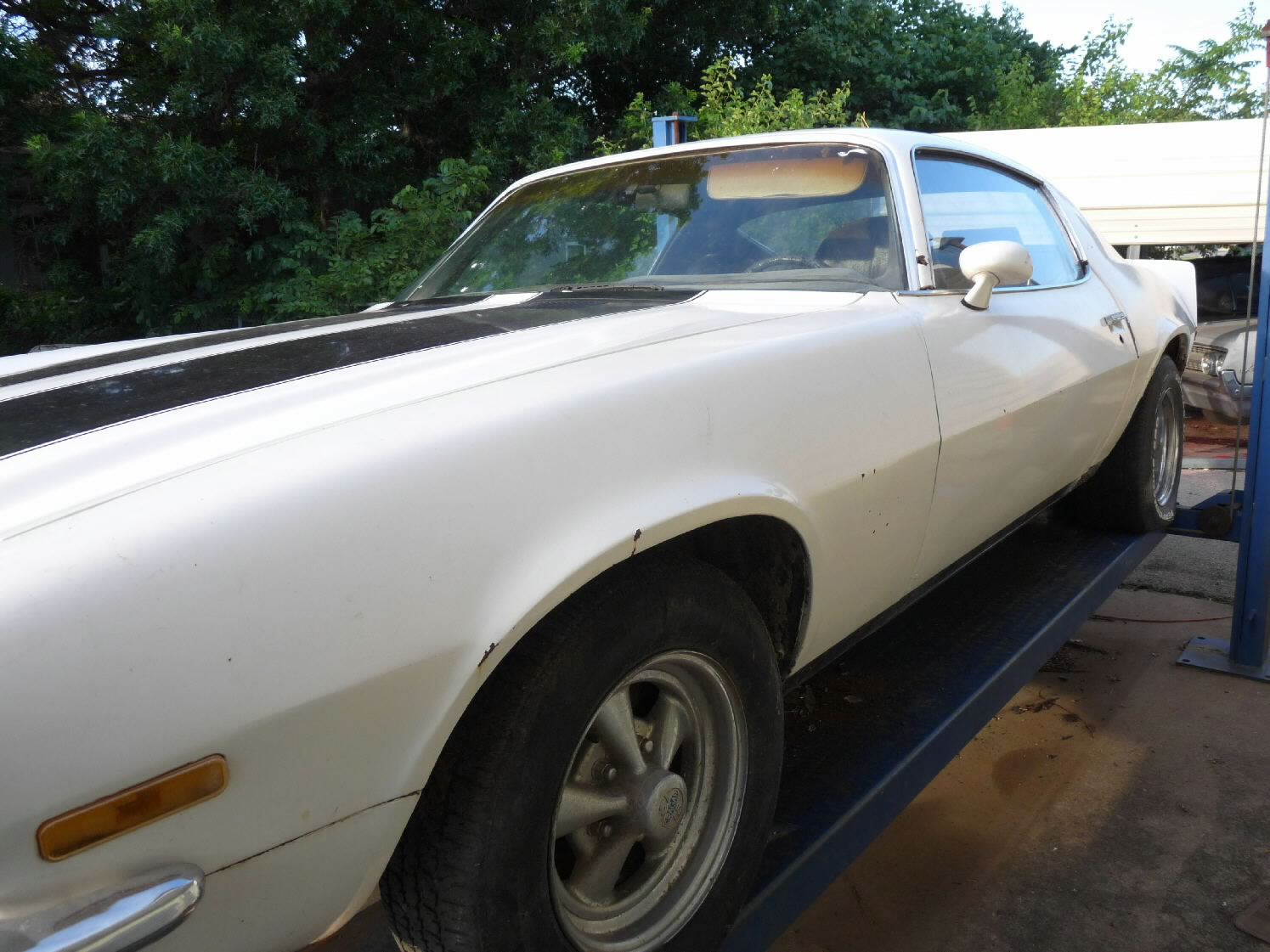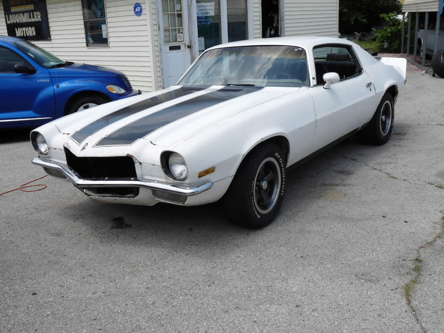 White w/black stripes, V-8, auto, runs & drives, needs driver's side quarter patch panel & passenger-side quarter panel