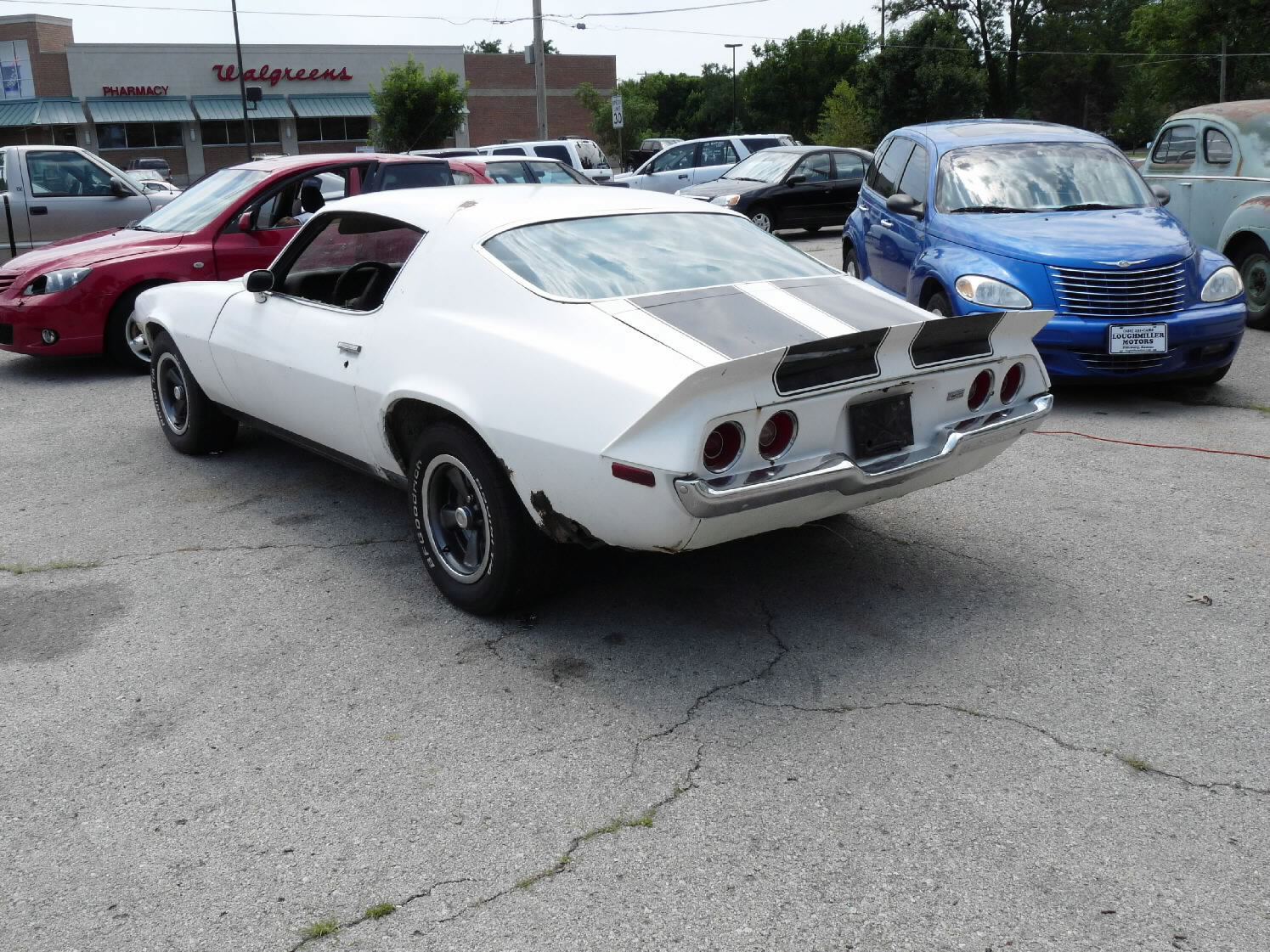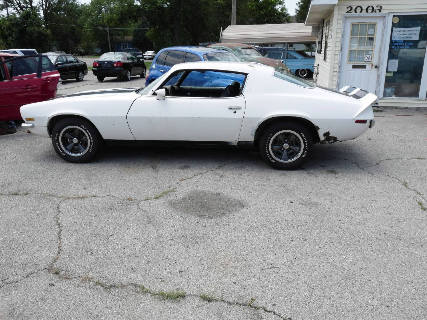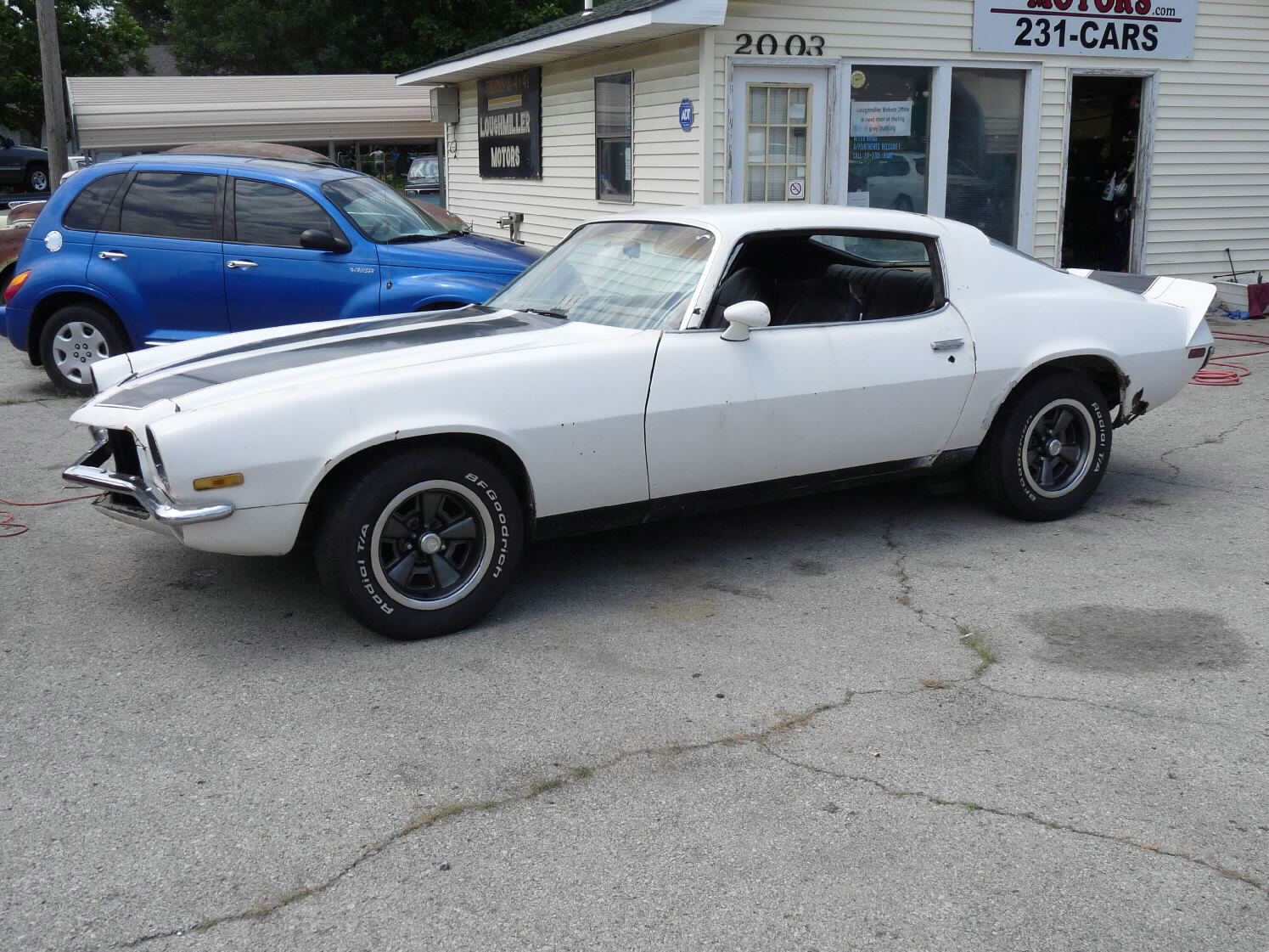 White w/black stripes, V-8, auto, runs & drives, needs driver's side quarter patch panel & passenger-side quarter panel
