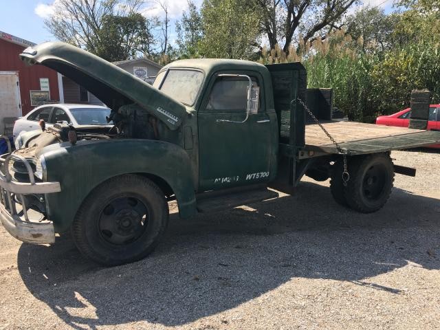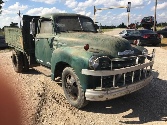 1949 Chevrolet series 4500 with unique custom wooden bed with...back in the day quality custom fold down wooden bedsides. This truck lot runs and drives & It has the granny four-speed. The truck looks like it just came out of the 60s and it looks to have been always shedded or garaged. The truck bed was manufactured in Denver Colorado and it has a couple of 3 inch x 4 inch identification plates noting that company name. All six of the 20 inch tires have probably 3/8 inch to 1/2 inch deep tread but the tires are older, but all are up and hold air and have held air for several weeks while in transit to my location. The seat I am sure has been recovered but it was recovered probably back in the 60s or 70s with that heavy medium brown Naugahyde and is still in perfect condition. The complete headliner is still in place, its that heavy painted cardboard style with a couple of metal factory bows holding it in place, although it is sagging in a couple places. It has the original vacuum wipers. The chrome clad glove box still operates & the cardboard glovebox liner is still intact and in place and probably full of a lot of the information about the trucks history. The front bumper is definitely a custom-made bumper and bumper guard assembly and is in excellent condition. The paint on the truck looks to be the original factory green paint with the factory silver 1/4 inch wide pinstriping on the grill. Condition of the paint is great for its age and looks great it a few feet back. The only rust on the truck are probably the (2) 2 x 3 spots on the bottom of the front fenders right above the runningboards and thats it ( our pictures will highlight those areas). The truck is missing the two steel door panel pieces that cover the window regulator mechanism and doorhandle mechanism but they may show up with the rest of the parts. It does have the original wooden sideboard extensions that make the bedsides taller and they are in great condition with the exception being the a few boards on the tailgate extension. This truck would make a very unique business advertising tool. And it would be great for a fall festival display/pumpkin patch with pumpkins on it or a business w/its products displayed in the bed of truck with the sides down.