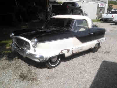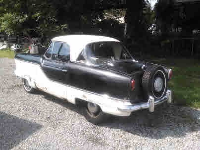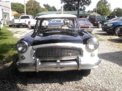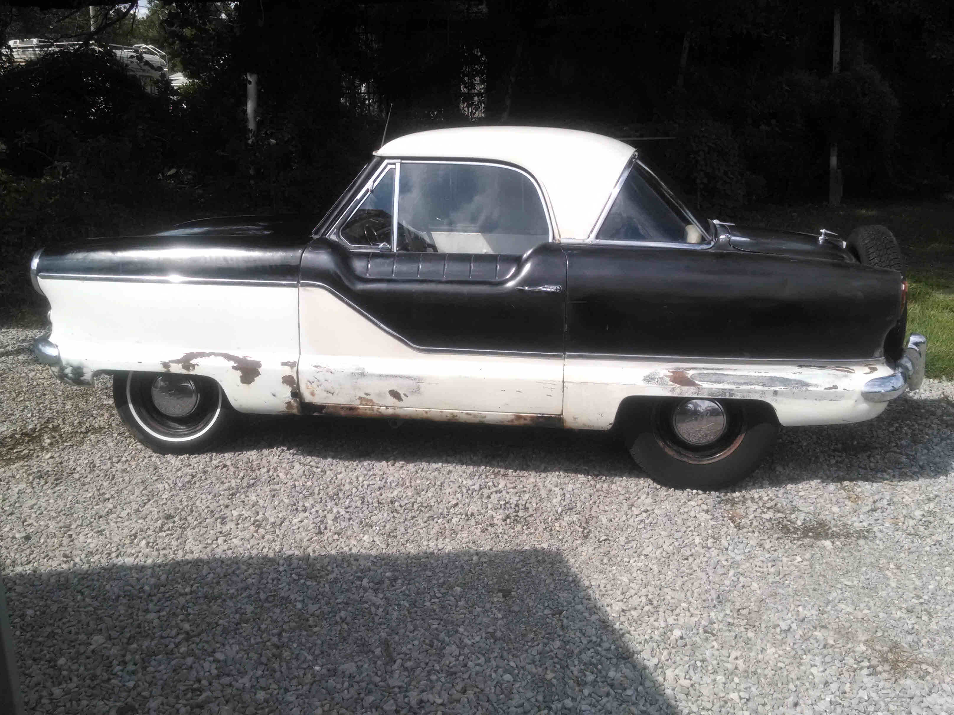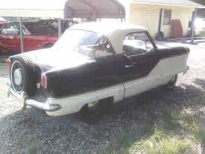 IT DOES RUN & DRIVE. It was originally red and white, now black & white, 4-cylinder, 3-speed, like new tires, excellent glass all around w/no fogging. The black & white vinyl front seat is a split bench and the rear seat back folds down for added access to the trunk. The trunk floor is 100% solid and the deck lid latch works, but no key to lock it. The floorboards are in need of patching. The spare is in its factory position right on top of the rear bumper and attached to the back of the car. The headlights work as do the park-lights. It has blinkers, but at present time they do not seem to work. It does need either a kit for the clutch master cylinder or slave cylinder or the system properly bled ??...as time permits I will address the necessary repairs to get the clutch to where it operates as it should. Presently you can start the car in gear and syncro-shift into the other 2 gears. The chrome bumpers look great at a couple of feet back and all of the cars chrome is in place on the car. The body looks great at a few steps back but it does have a few small areas of localized rust. It has wipers, but I have not checked to see what is needed to make them work. The headliner is white, intact and nice w/ no rips or tears; the sunvisors are nice also. This is a hardtop car, and the top is NOT removable. This little Nash is perfect for that Saturday evening ice cream run to your favorite spot. Lots of "cute as a bug" charm w/this little Metropolitan.