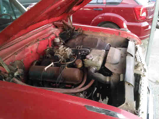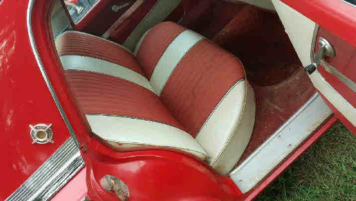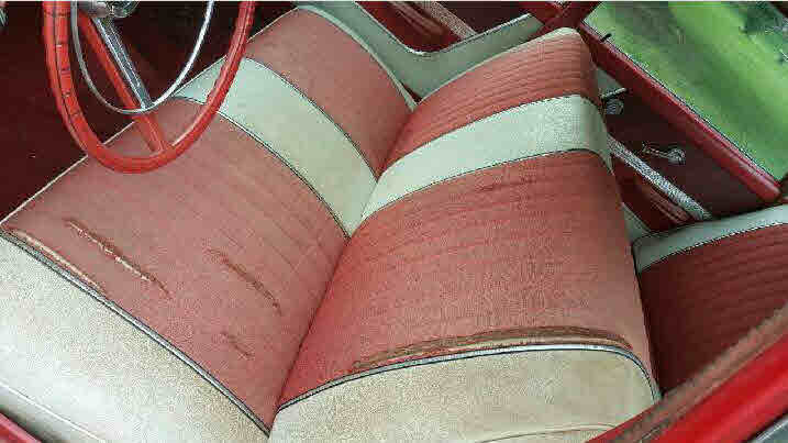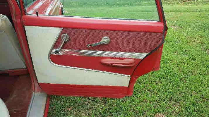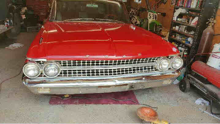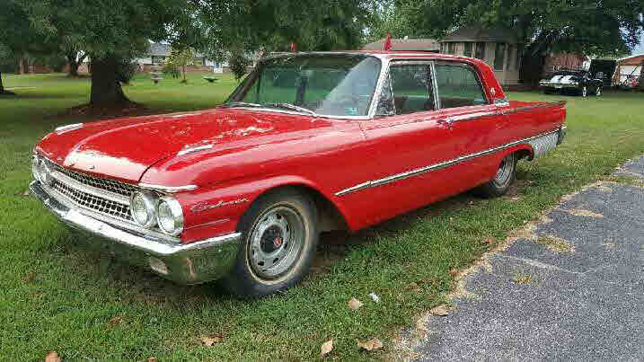 352 ??? V-8 w/automatic, ONE OWNER. COMES W/ORIGINAL PURCHASE PAPERWORK & INFORMATION FROM 1962 as well as the original title. We have driven the car around the lot and it seems to run smoothly and the brakes work...we recently installed a couple of new wheel cylinders. THE EXTERIOR COLOR IS BRIGHT RED---Ford called it Monte Carlo red---it was repainted yrs. back to what appears to be the same color red---the jams are original and were not repainted and will polish up great. The engine starts and runs off of a gallon gas jug under the hood--the fuel pump pumps the gas from the jug to the carburetor w/o any trouble...as time permits I will look into the gas tank/fuel lines to see if there are any issues preventing the use of the complete fuel system The car does NOT have power steering, power brakes, A/C, nor power windows. All of the glass in the car is good and the windows roll up and down effortlessly. It appears to have the original bench seats front and rear, all covered with the original factory red and white material from 1961. The door panels are all in excellent shape and the dash pad is real nice with just a small crack from each corner of the one speaker which is mounted in the center of the dashs top surface. The headliner and the sunvisors are original as well and in excellent condition. The factory red carpet is all there and intact but faded and worn in places.