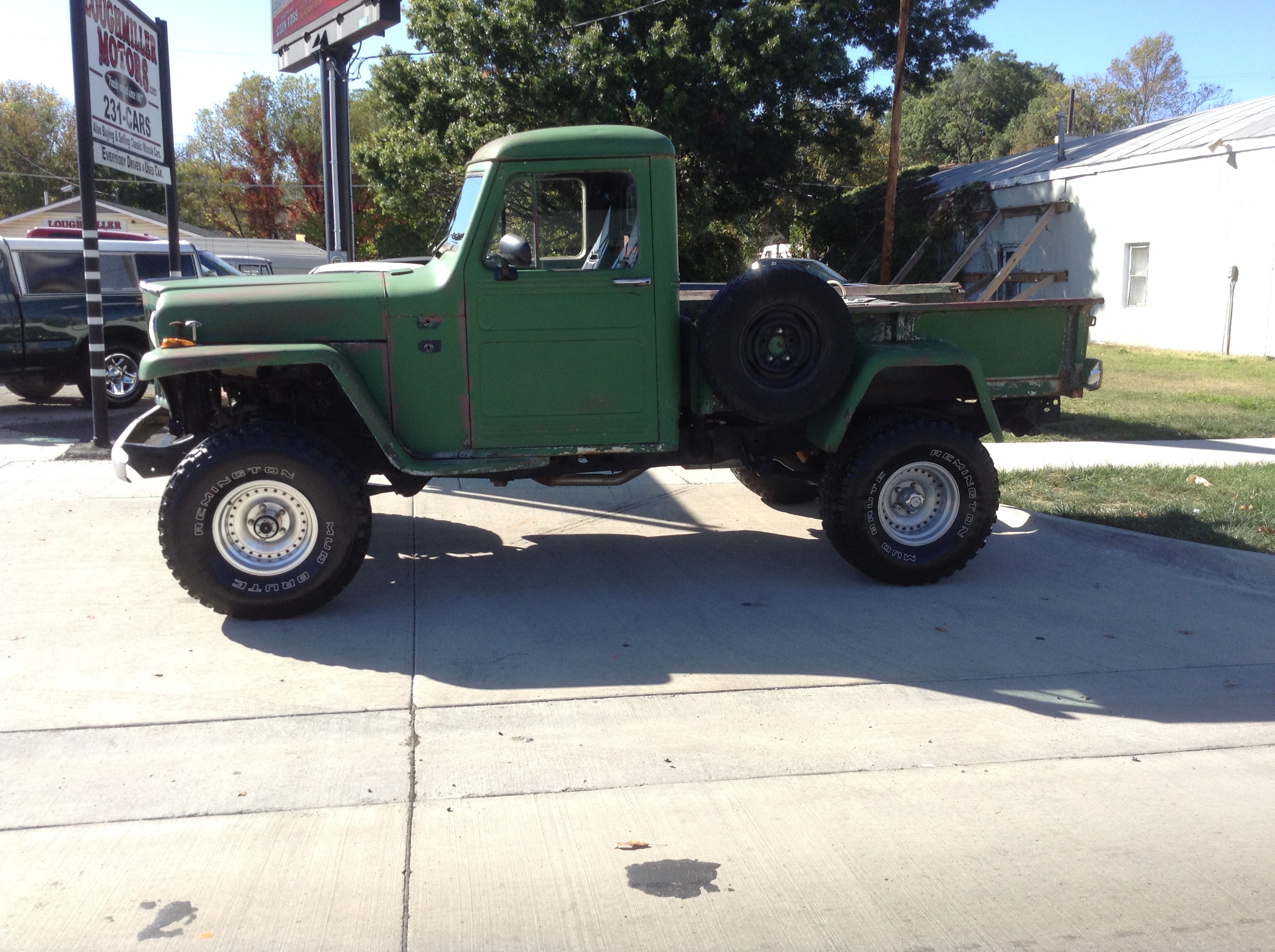 THIS IS ONE MEAN 53 WILLYS, AND IT WAS AN EVERYDAY DRIVER FOR THE PAST SEVERAL YEARS. IT'S GOT A EARLY FORD "429" WITH THE C6 TRANNY BEHIND IT, THE 53 TRUCK CAB AND BED ARE SITTING ON A SHORTENED 1980 FULL-SIZE BRONCO CHASSIS AND SUSPENSION WITH POWER DISC BRAKES UP FRONT AND A POSI REAR END. IT HAS POWER STEERING TO HELP TURN THOSE BIG 35" x 12.50 MEATY LUGGED TIRES MOUNTED ON NICE 15 INCH SOLID FACED ALLOY WHEELS. THE BRUTE ''429'' IS CARBURETED--EDELBROCK 4 BBL--AND HAS A MILD CAM WITH A MILD HIGH RISE EDELBROCK INTAKE W/PORTED AND POLISHED HEADS AND A ROLLER ROCKER VALVE-TRAIN---BELIEVE ME THERE'S NO WANT FOR MORE TORQUE AND/OR POWER WITH THIS BRUTE OF A WILLYS PICK-UP. IT'S FED BY A FUEL CELL IN THE BED AND ENERGIZED BY THE BATTERY LOCATED IN THE BED ....AND IF TIME PERMITS BEFORE THIS SELLS WE PLAN TO RELOCATE THE FUEL CELL AND THE BATTERY TO A LOCATION BENEATH THE BED. THE BED FRAME AND BED SUPPORTS ARE SOLID BUT THE ORIGINAL BED FLOOR HAS BEEN REPLACED WITH A PIECE OF THREE-QUARTER INCH PLYWOOD. THE CAB AND BED ARE VERY SOLID WITH ONLY MINOR MINOR RUST LOCATED AT THE TAILGATE HINGE AREA---AT EACH END. THE CAB FLOORBOARDS ARE SOLID ALSO AS IS THE ORIGINAL PEDESTAL THAT THE SEATS ARE MOUNTED ON. THE ORIGINAL BENCH SEAT IS GONE AND IN ITS PLACE ARE TWO RACING BUCKETS WITH SEATBELTS. THERE IS NO TAILGATE AT THIS TIME... BUT THAT MAY CHANGE IF TIME PERMITS BEFORE THIS WILLYS SELLS. THE LIGHTS AND BLINKERS WORK AS DO ALL OF THE ORIGINAL GAUGES WITH THE EXCEPTION OF THE GAS GAUGE. THE WINDSHIELD IS THE SPLIT WINDSHIELD TYPE AND AT PRESENT TIME THERE IS NO CENTER DIVIDER BETWEEN THE TWO PIECES OF GLASS. THE REAR GLASS IS GOOD AS IS THE DRIVERS DOOR GLASS AND VENT WINDOW GLASS, BUT THE PASSENGER GLASS HAS A CRACKED GLASS AND CRACKED WING WINDOW. THE TWO CRACKED GLASSES ARE COMPLETELY INTACT, AS THEY ARE LAMINATED GLASS. THE FRONT BUMPER IS STRAIGHT AND SOLID AND AT THIS TIME THERE IS NO REAR BUMPER.