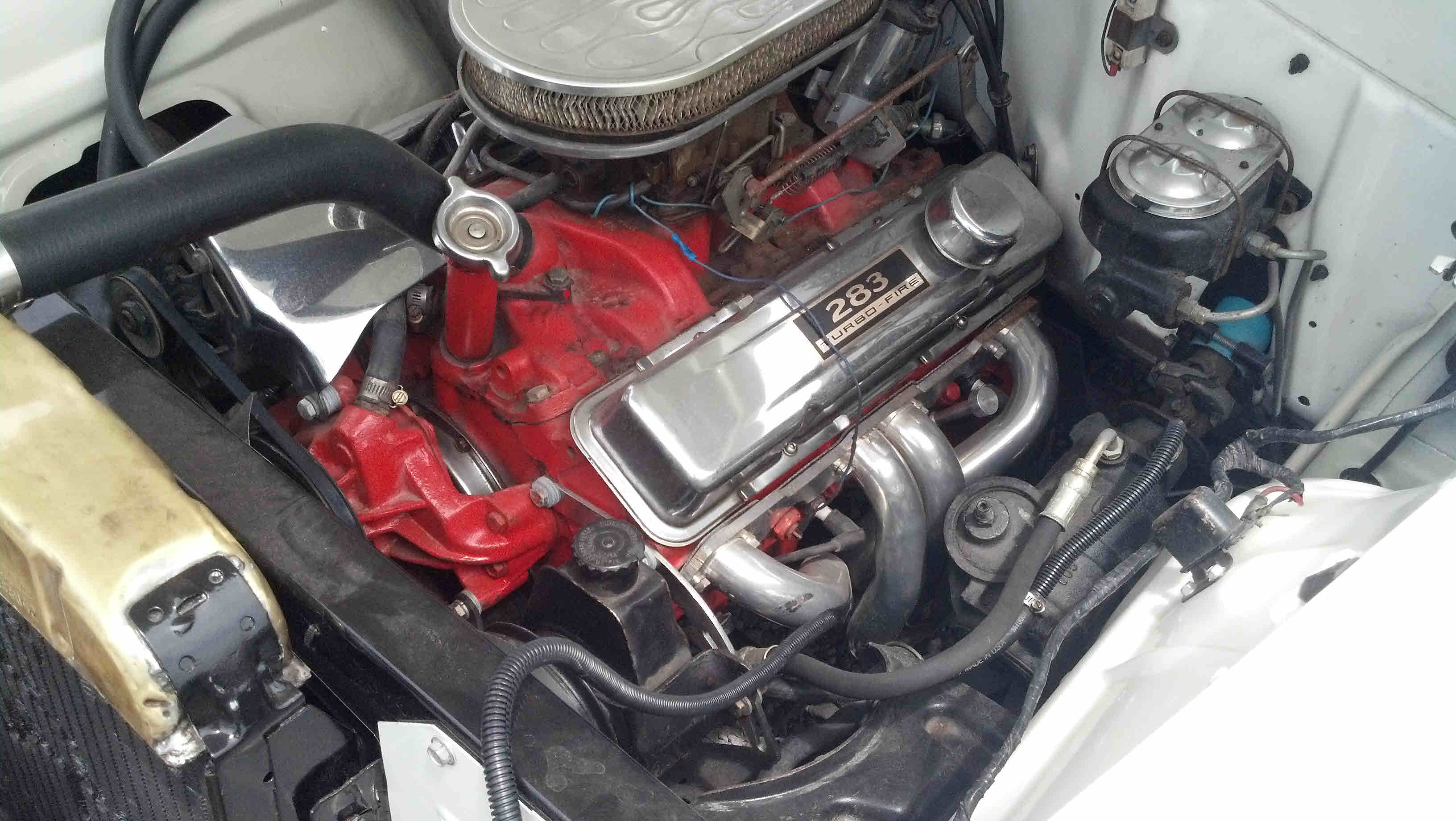 White, w/PROFESSIONAL/turquoise & white vinyl bench seat interior, floor-shift automatic that looks like a 4-spd., tinted glass, 283 V-8 w/coated headers, 2-door post,excellent floors and trunk pans. THIS IS A REAL FACTORY ORIGINAL '150 BUSINESS-COUPE' which NEVER HAD A BACK SEAT FROM THE FACTORY and the business coupes came from the factory w/stationary rear side windows. It sports a custom 2" cowl hood (fiberglass--w/paint on the underside as slick as the topside). THE 15" TORQUE THRUST STYLE WHEELS W/LIKE NEW TIRES ARE ON THE CAR FOR STAGING PURPOSES ONLY----I'VE ADJUSTED THE PRICE ACCORDINGLY (If you want the wheels and tires shown we'll take $800 for them. (We'll mount a set of rollers on the car for your loading and unloading purposes--these will be mismatched rims and tires and not balanced). Very nice 56 Cruiser w/rare classic lines--(LOWEST PRODUCTION #'S FOR 1956--RIGHT NEXT TO THE NOMAD) and only very few "business coupes" remain in existance. Runs and drives great and sounds even better!!.