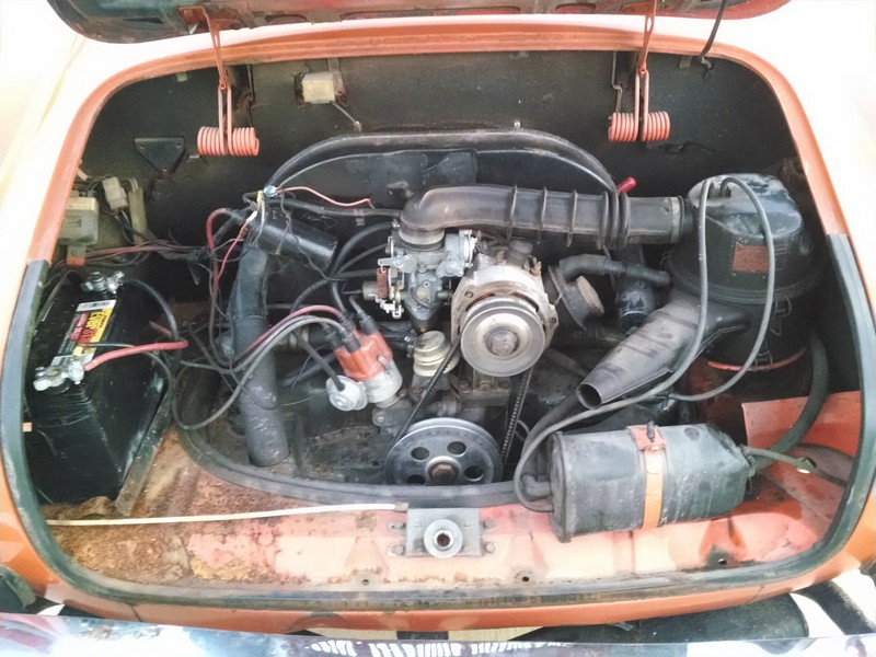 Orange, black vinyl interior, 4 cylinder, 4 speed, 2 door