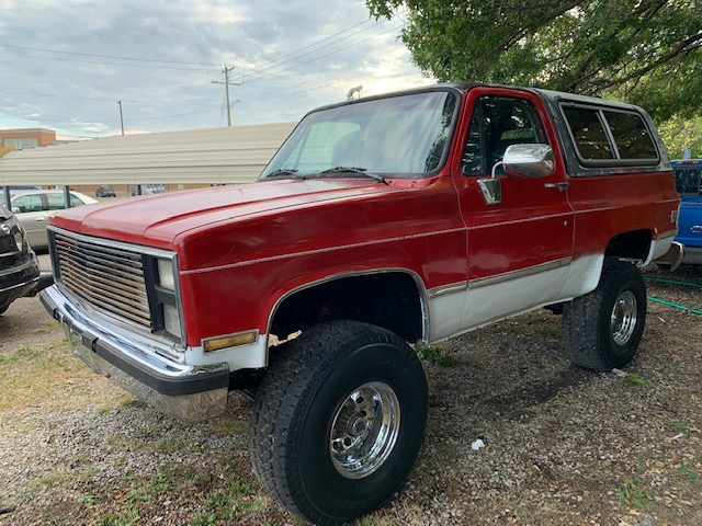 Red w/white top, red interior w/blue customized van seats, 5.7 liter V-8 fuel injected, auto, floor shifter 4x4, a/c (not working), tilt, power locks & windows (not working), power mirrors, sliding side windows